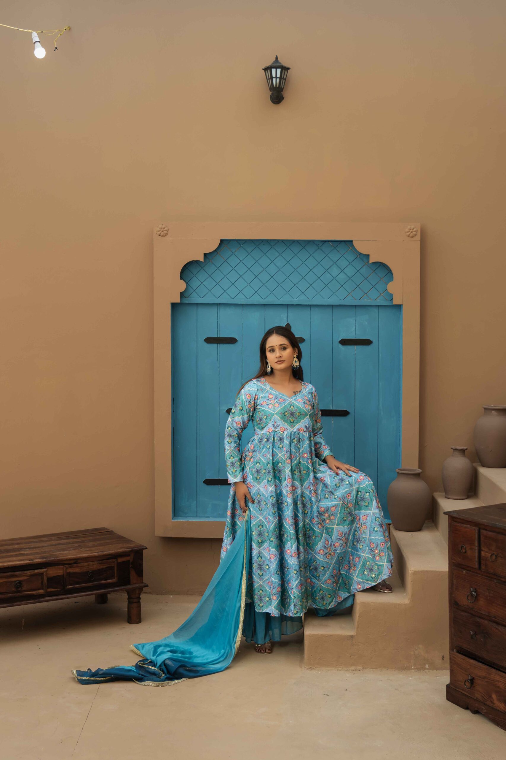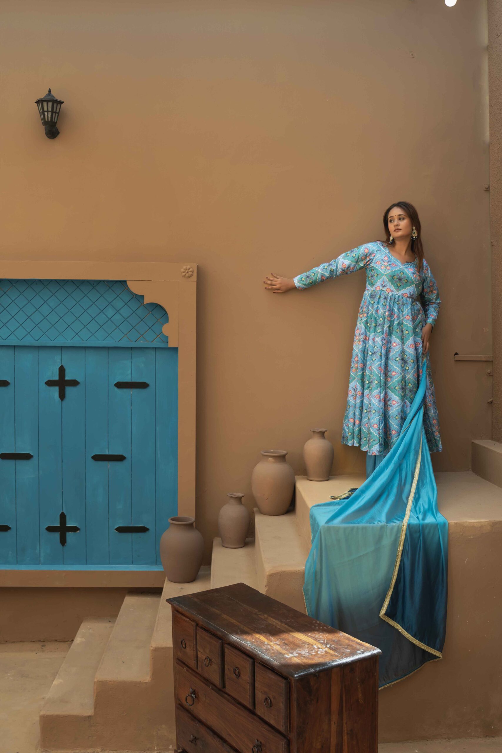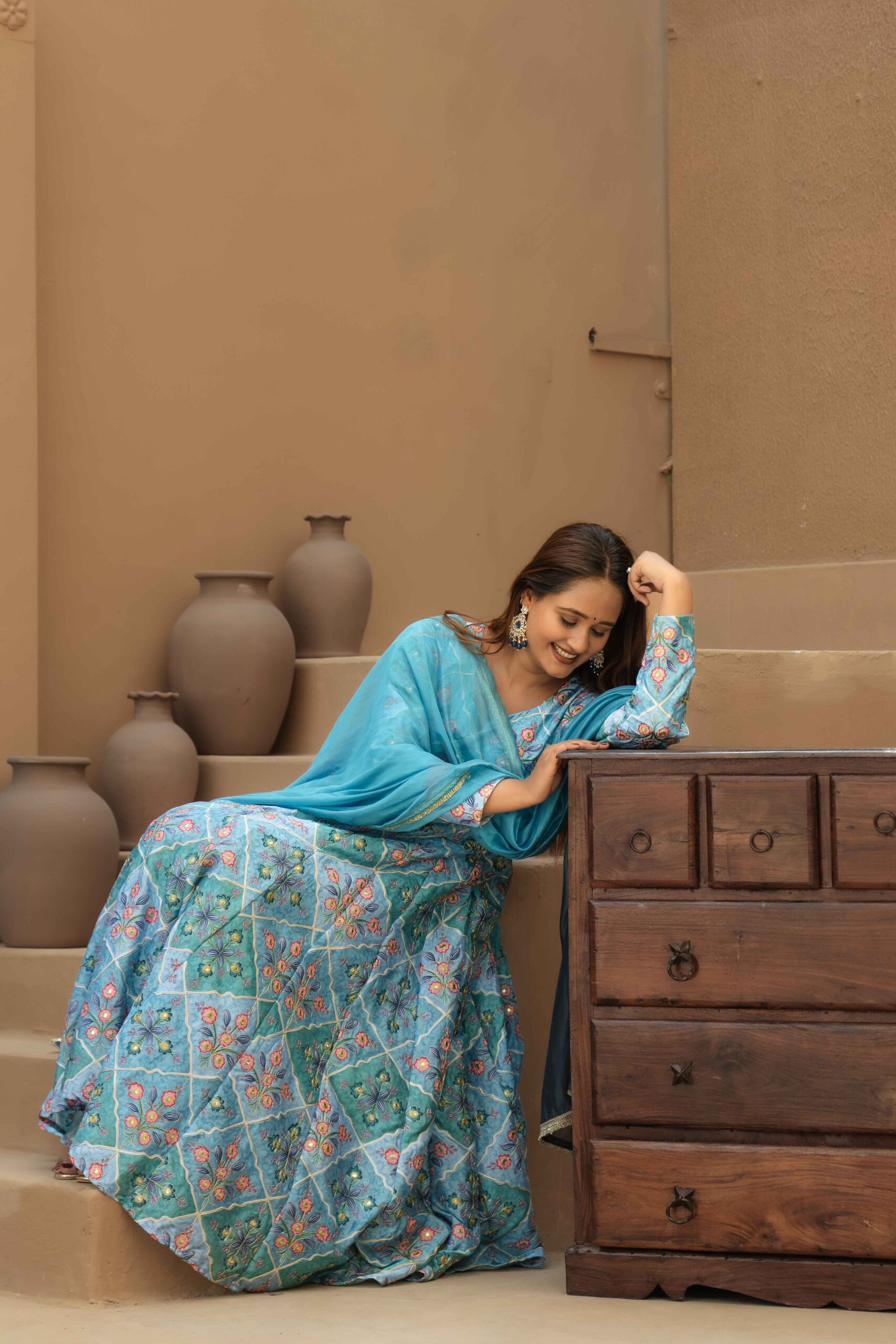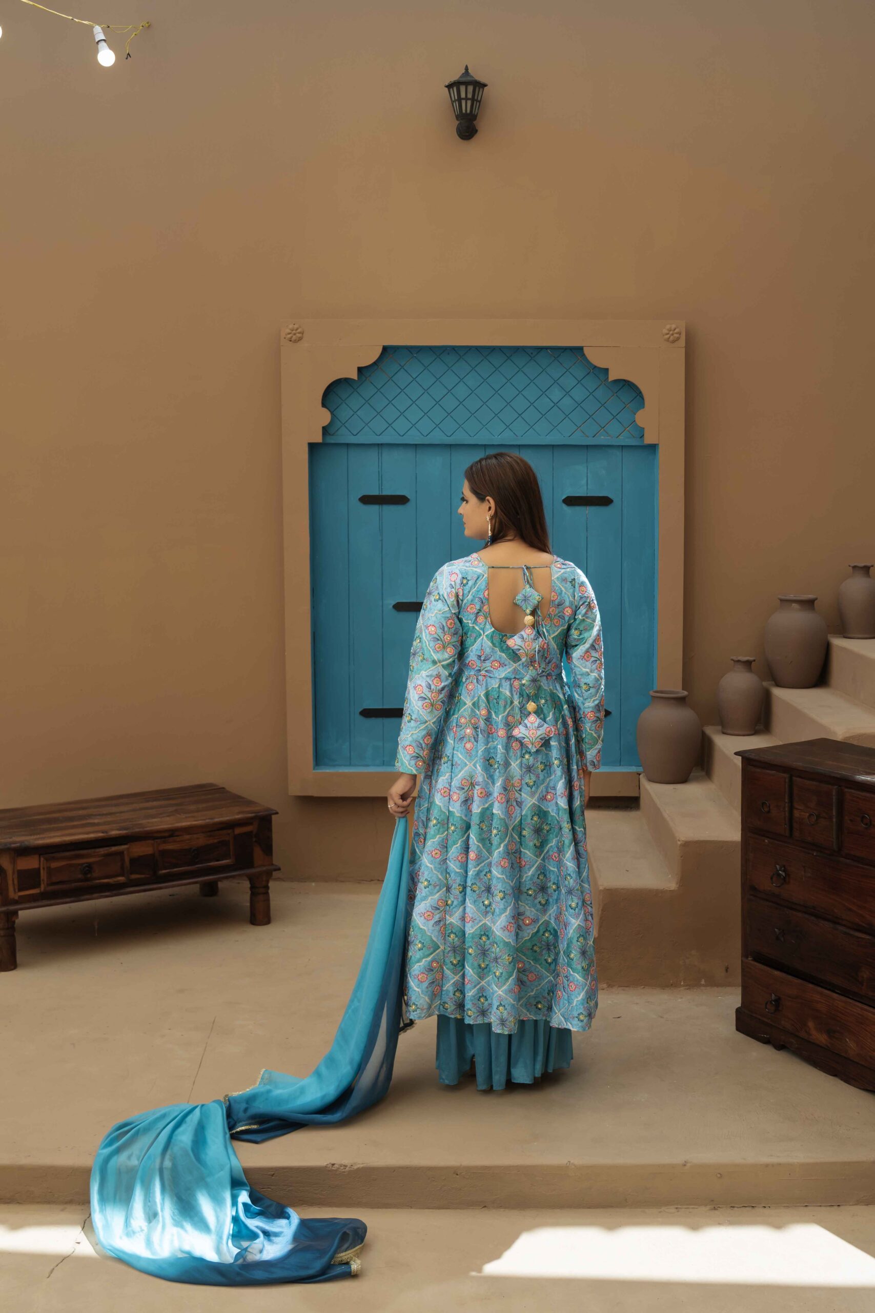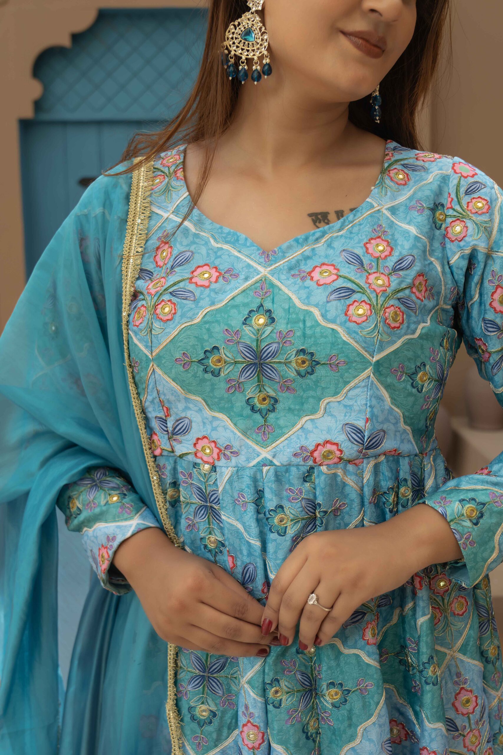 This stunning Teal Blue Embroidered Flared Anarkali Set from TEEJ is crafted to bring elegance and festive charm together.