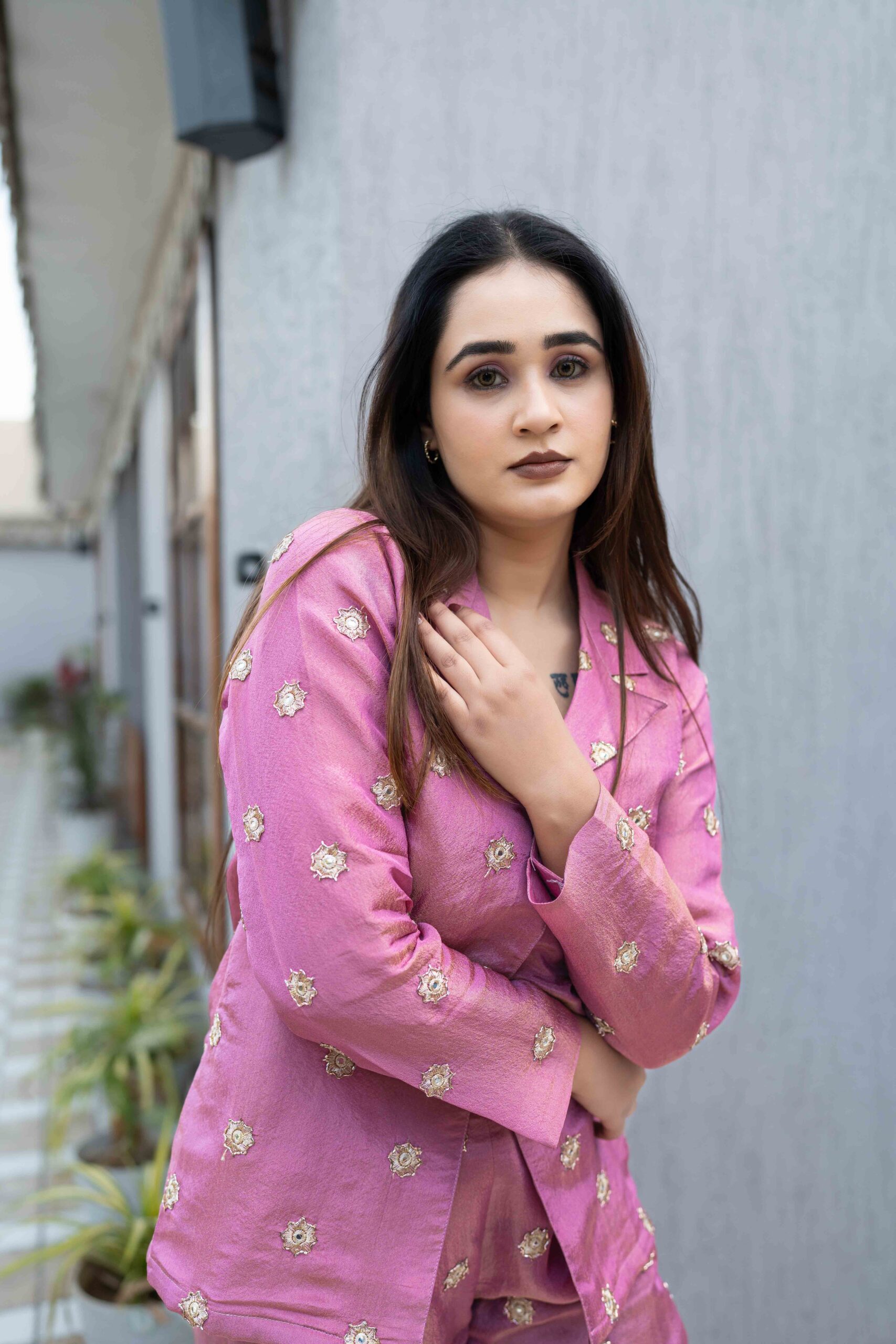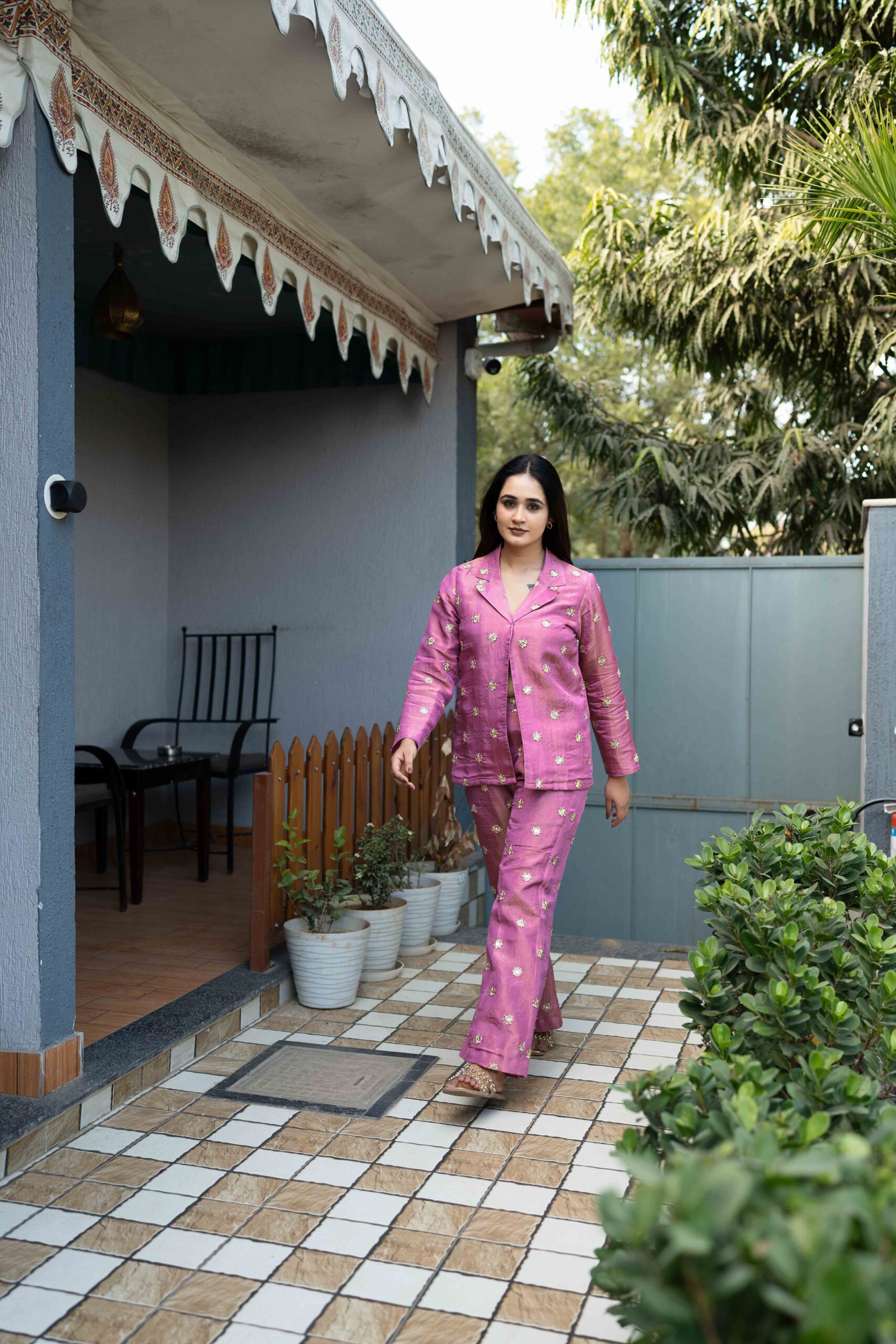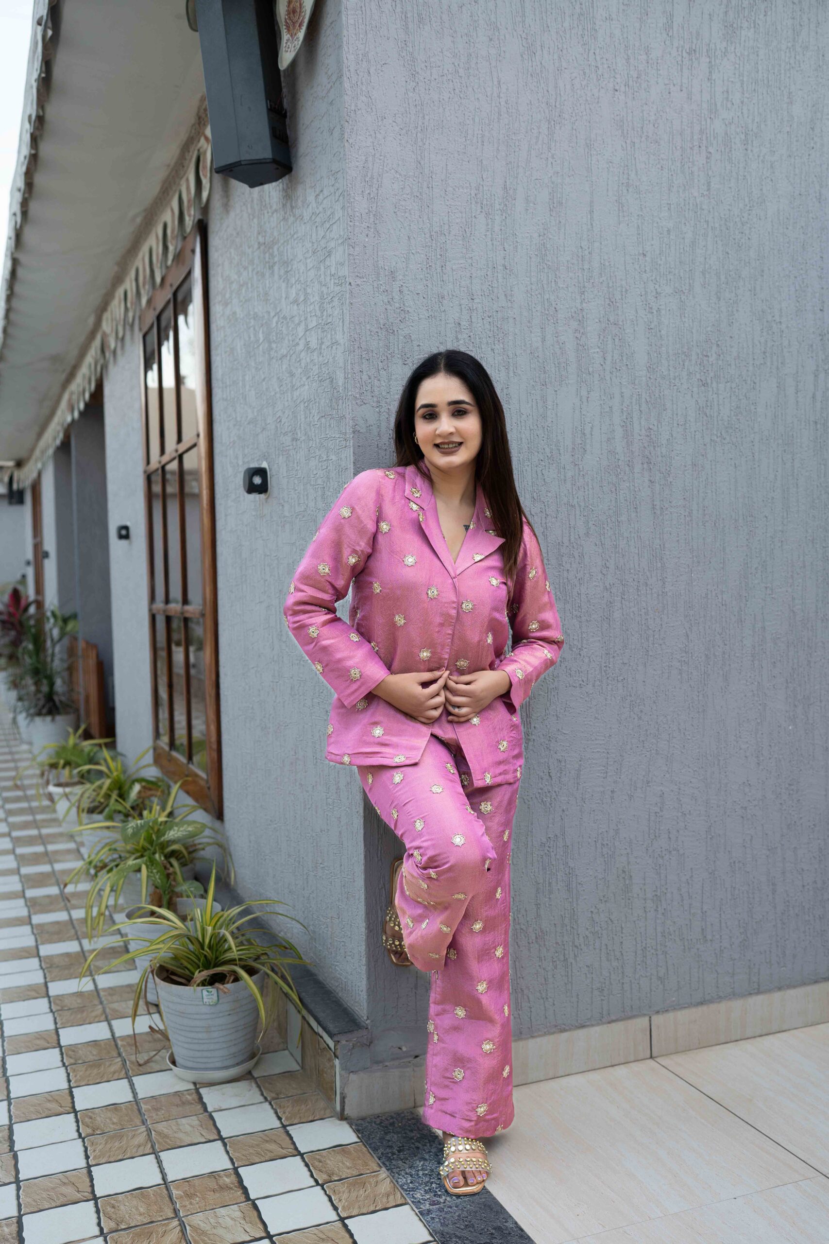 The blazer-inspired top paired with a matching bottom creates a polished yet festive silhouette, perfect for women who love statement looks with comfort. The subtle sheen and detailed craftsmanship make this set ideal for celebrations, intimate functions, festive evenings, and stylish day events.