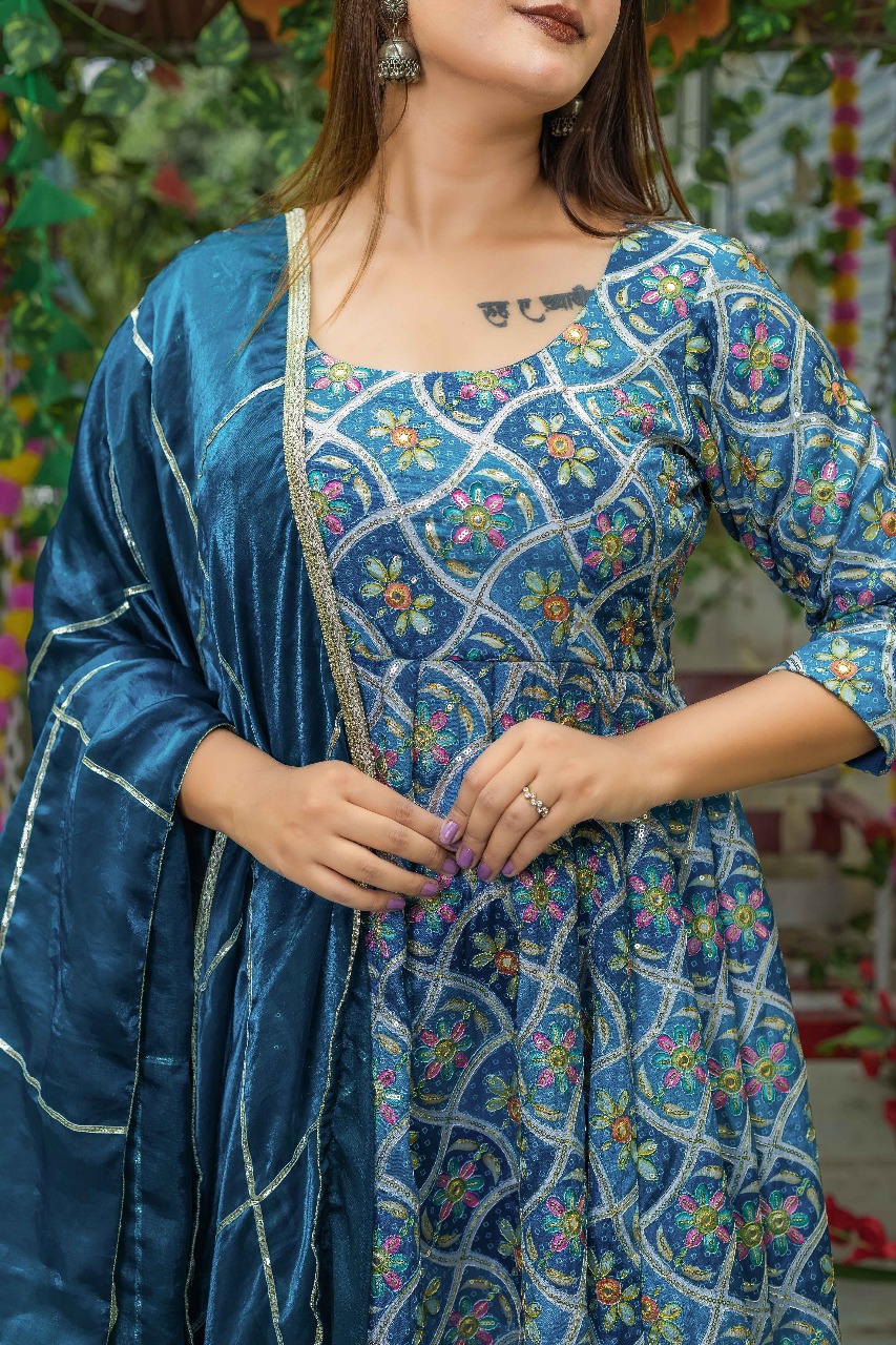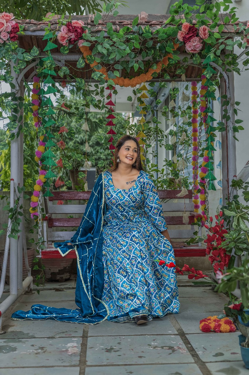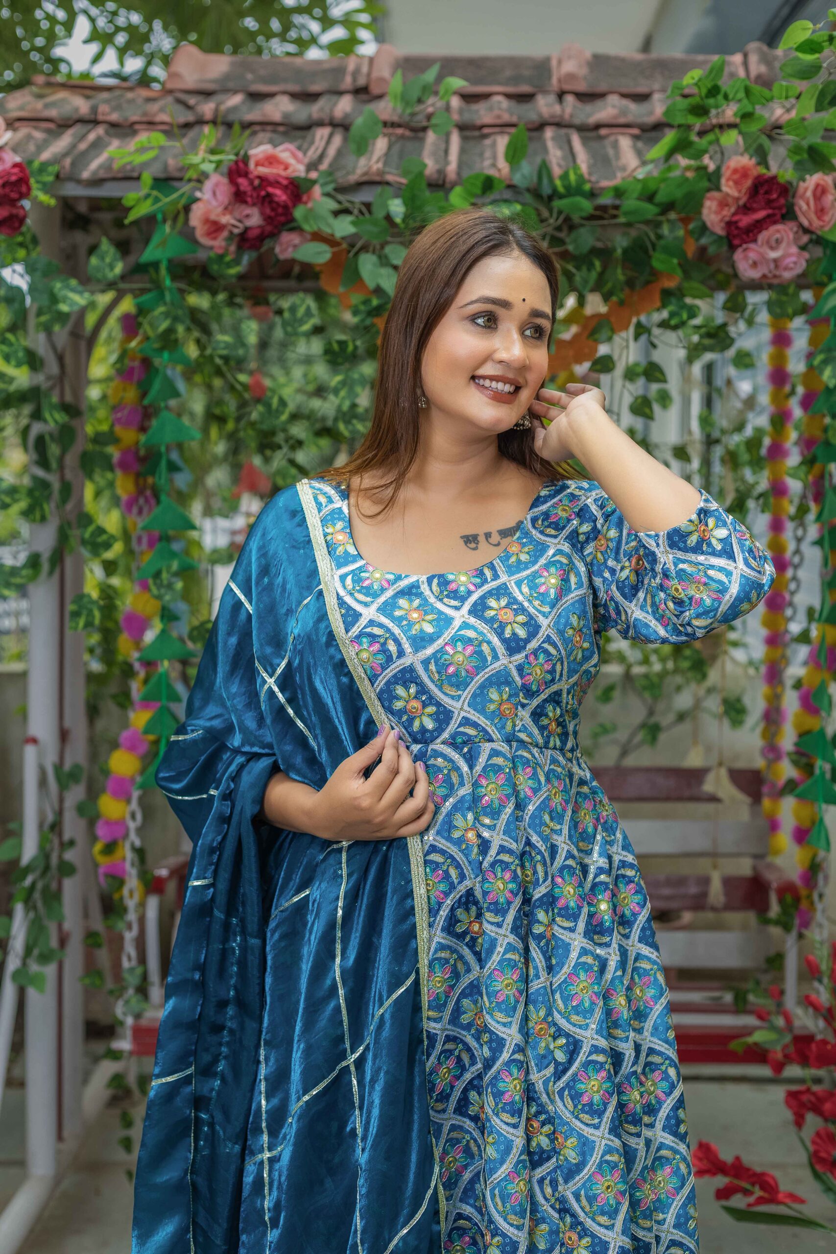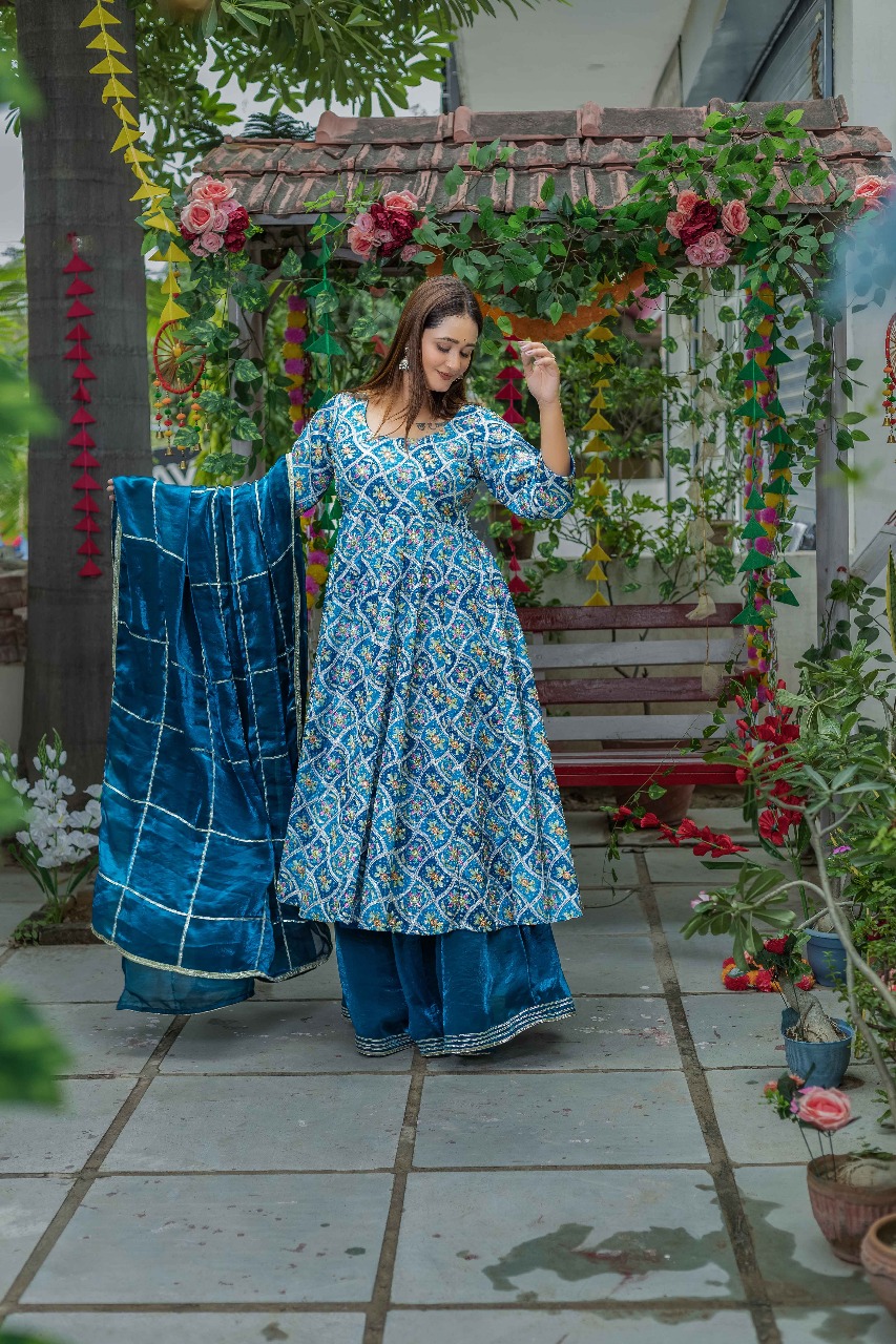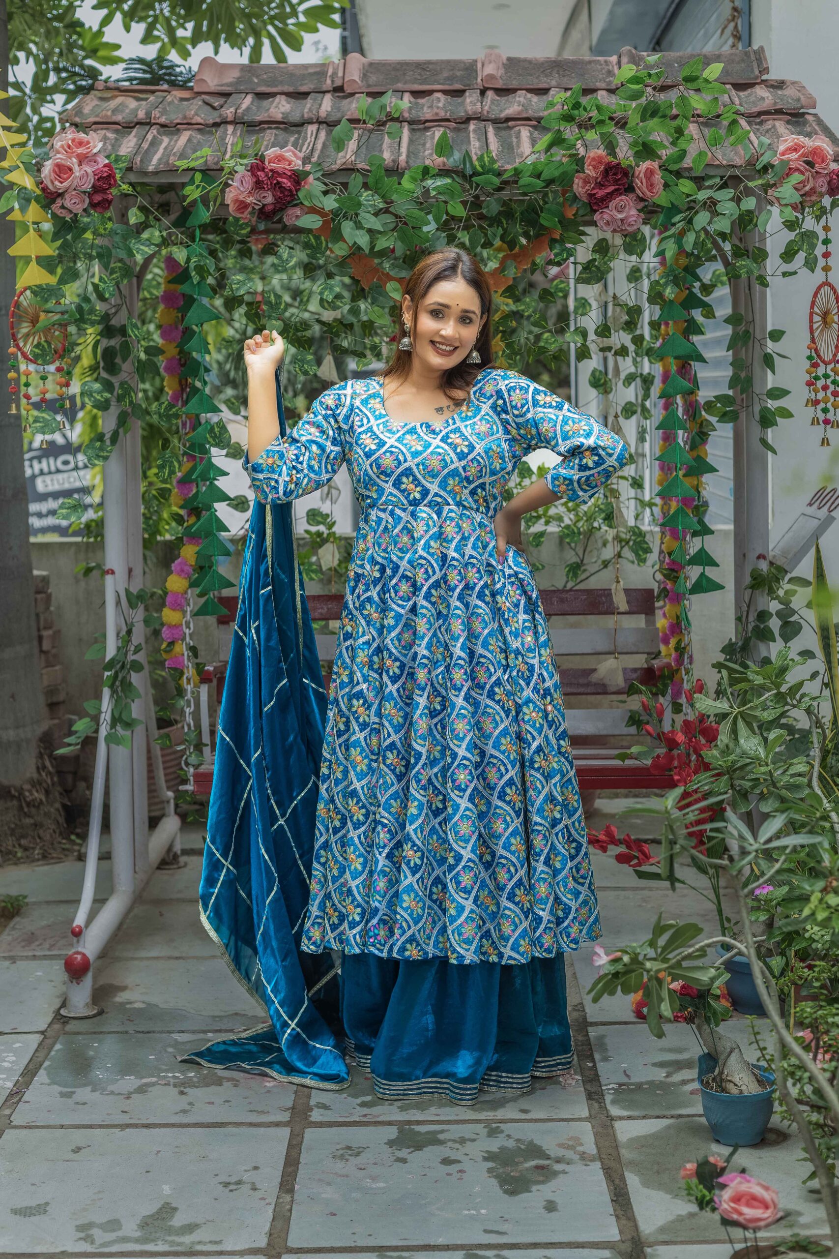 Premium printed Anarkali with dual tone silk sharara & dupatta, perfect for festive shoots and special occasions 💙