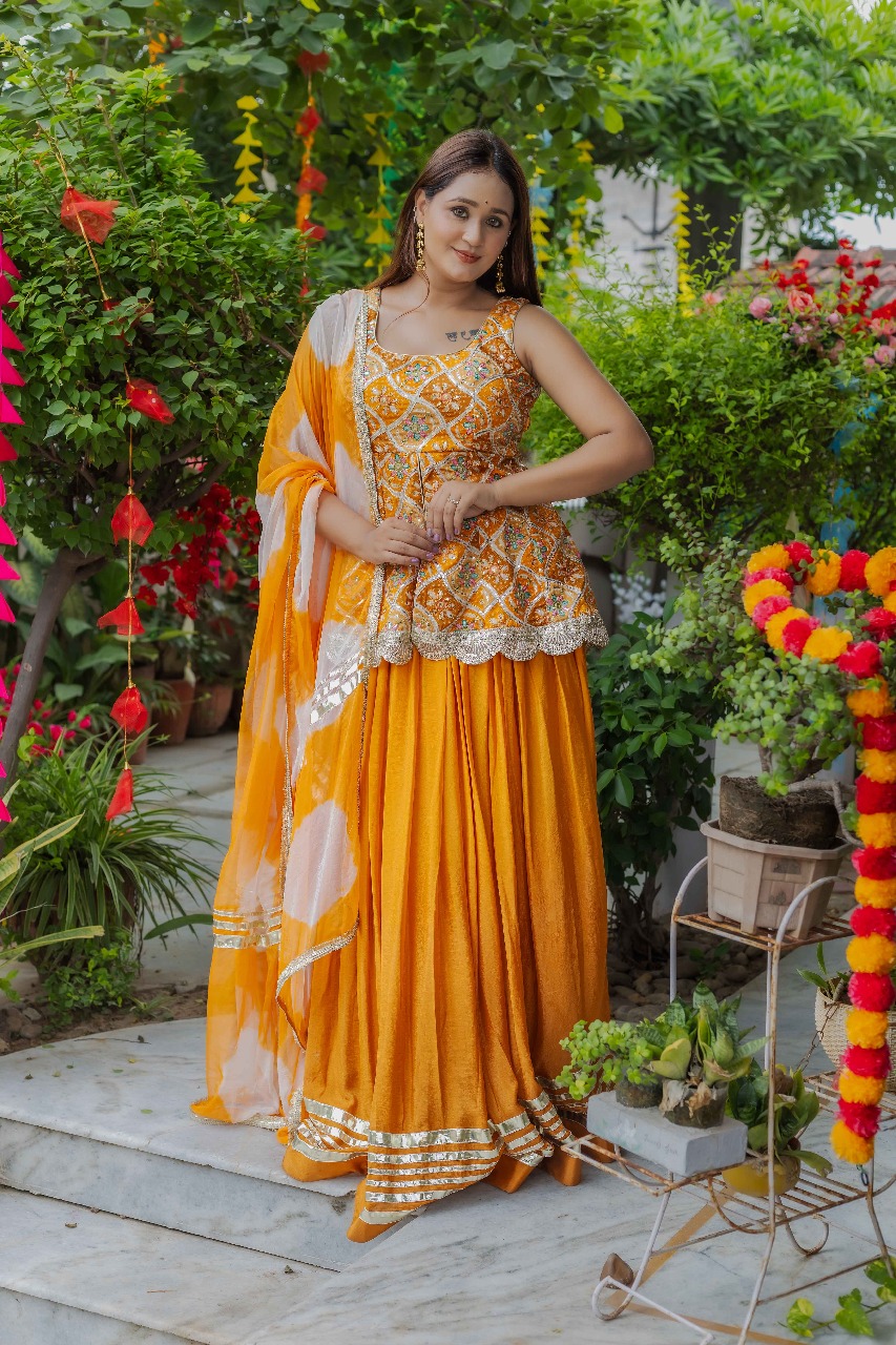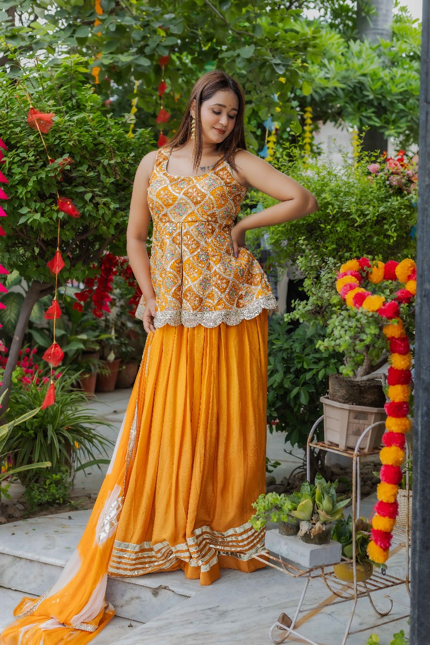 A mustard festive peplum set crafted in pure crepe for luxury movement and shine.