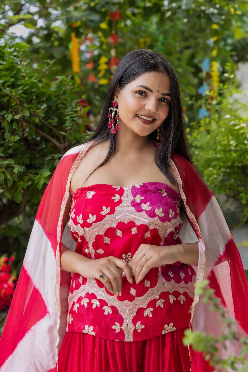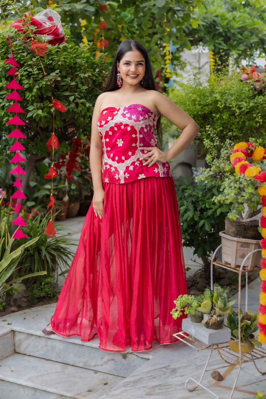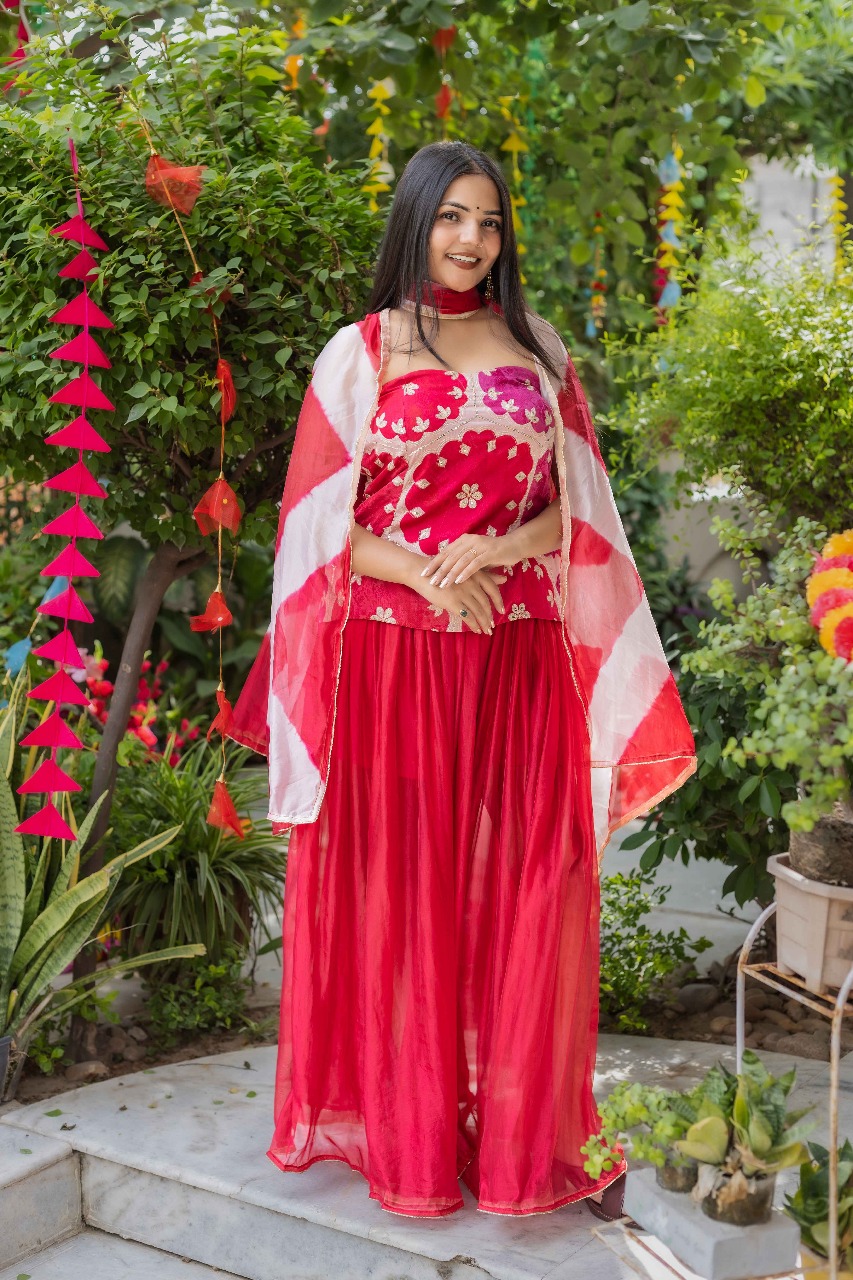 Celebrate this festive season in bold elegance with our Teej Rang โ Red Peplum Tebby Top & Plazo Set.