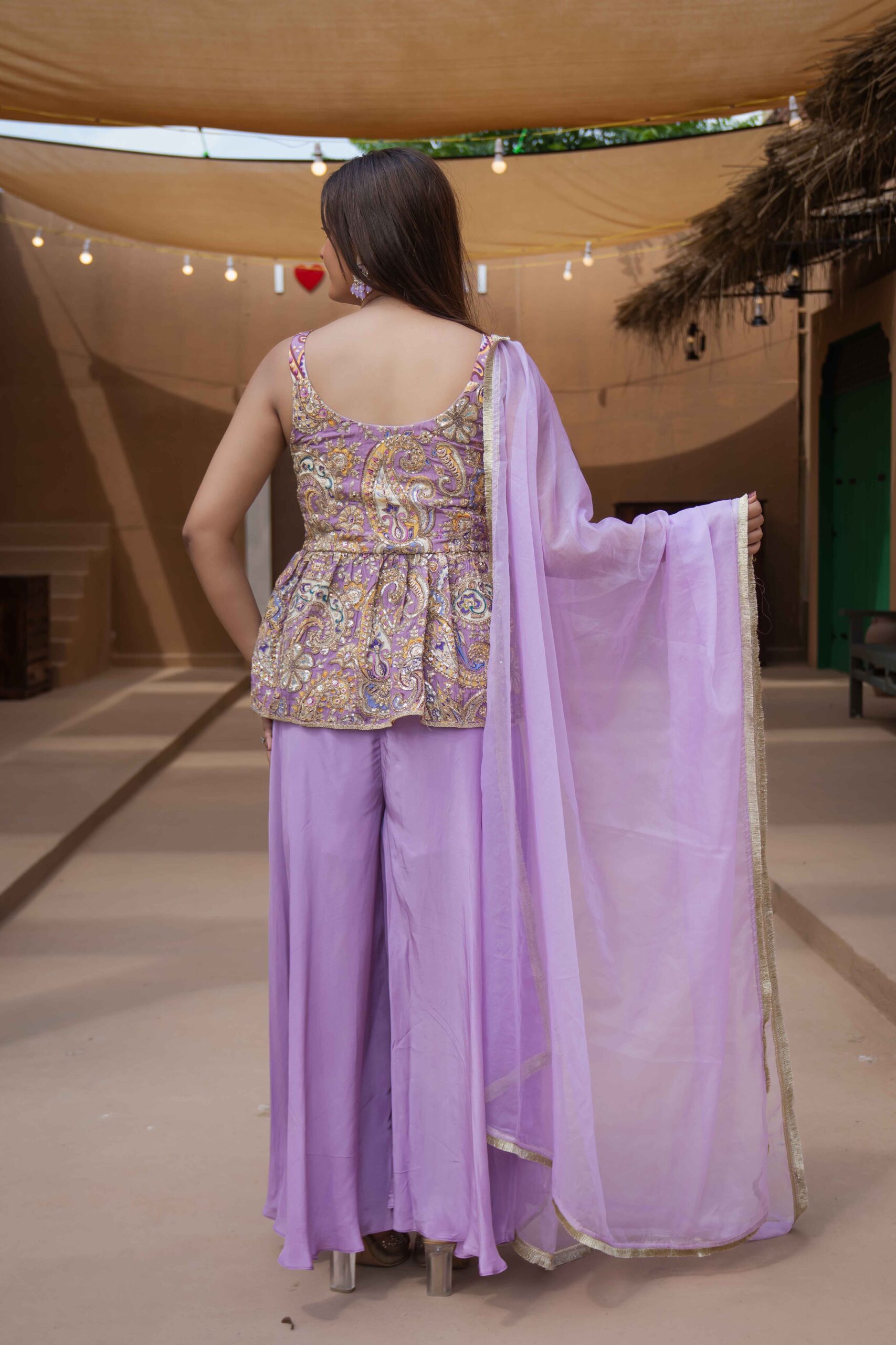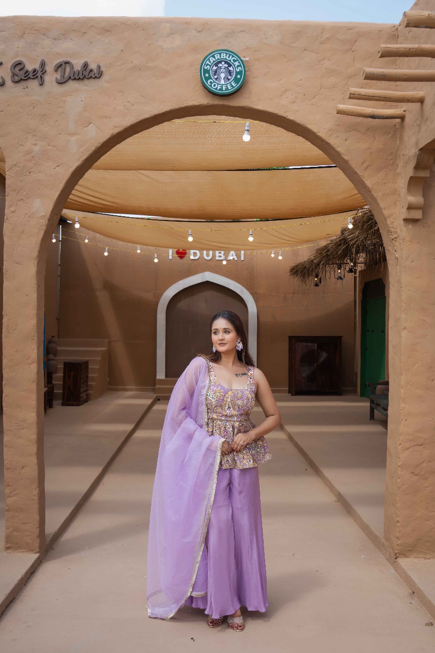 The embroidered peplum top features delicate mirror work and pastel thread artistry, giving it a premium handcrafted look. The matching lavender sharara flows beautifully, making every step feel dreamy โ€” perfect for outdoor shoots, heritage locations, and stylish festive entries.