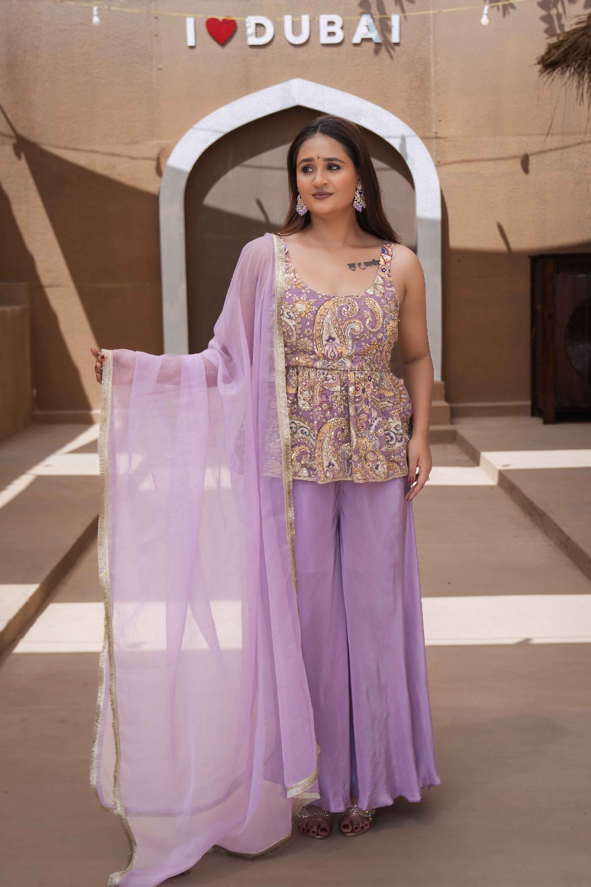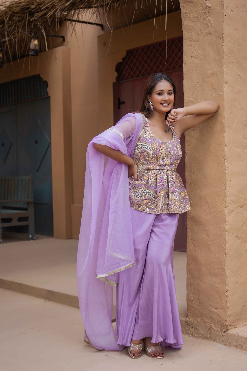 A pastel lavender embroidered peplum top paired with a flowy sharara and lightweight dupatta. Filled with mirror accents, threadwork, and premium stitching โ€” this set delivers effortless elegance for mehndi, Teej, haldi, and festive photoshoots.